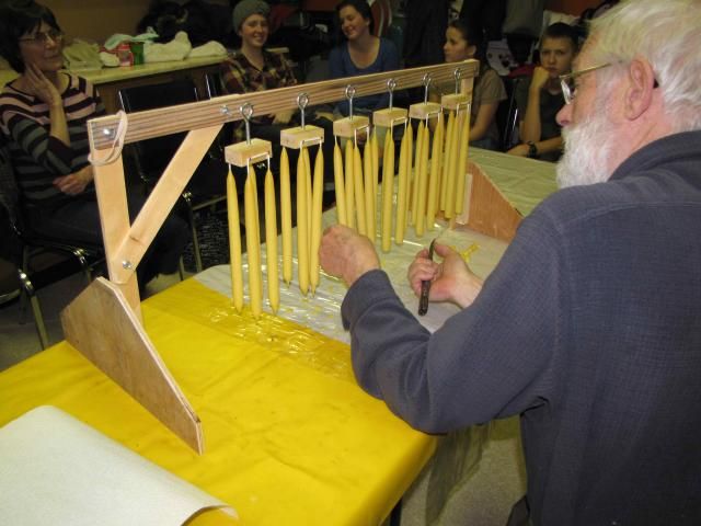Friday, December 5, 2014 at 11:24AM We had a great evening last night during our Candle Making Workshop. David Dawson taught us how to make lovely, sweet smelling, beeswax candles. He described how to make the equipment, how to safely melt the wax, and the dipping technique that creates professional looking candles. We all took turns dipping and within 1 1/2 hours we had some gorgeous looking creamy yellow candles. Thanks David!!